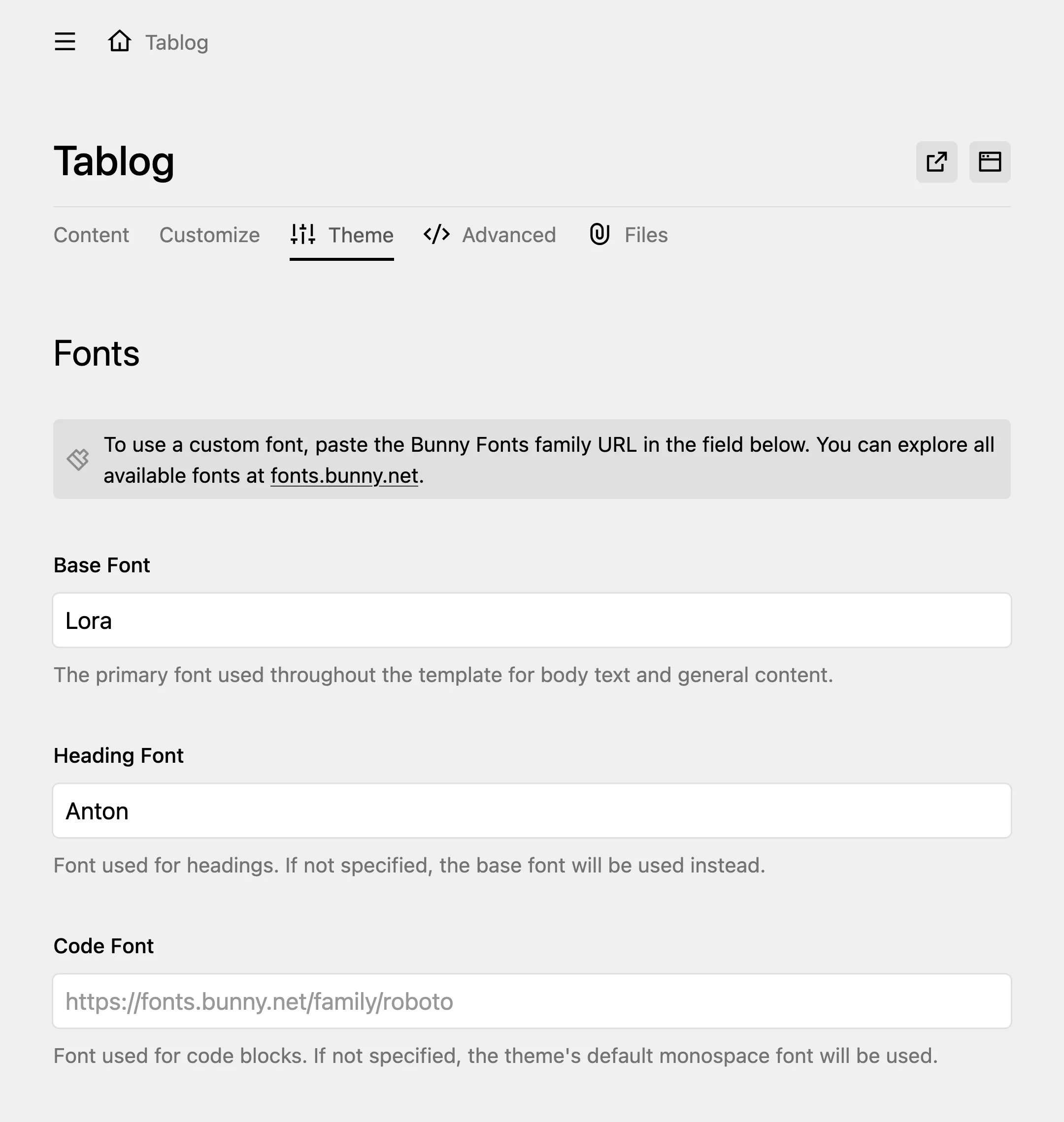 tablo.theme.lightboxPreloadtotablo.lightbox.preload(default: 3) - added ability to define custom fonts for base, headings, and code blocks