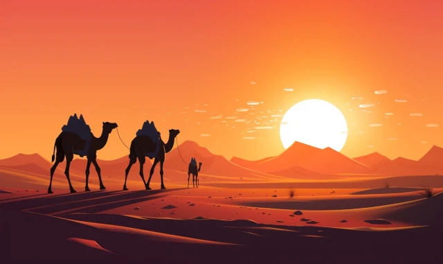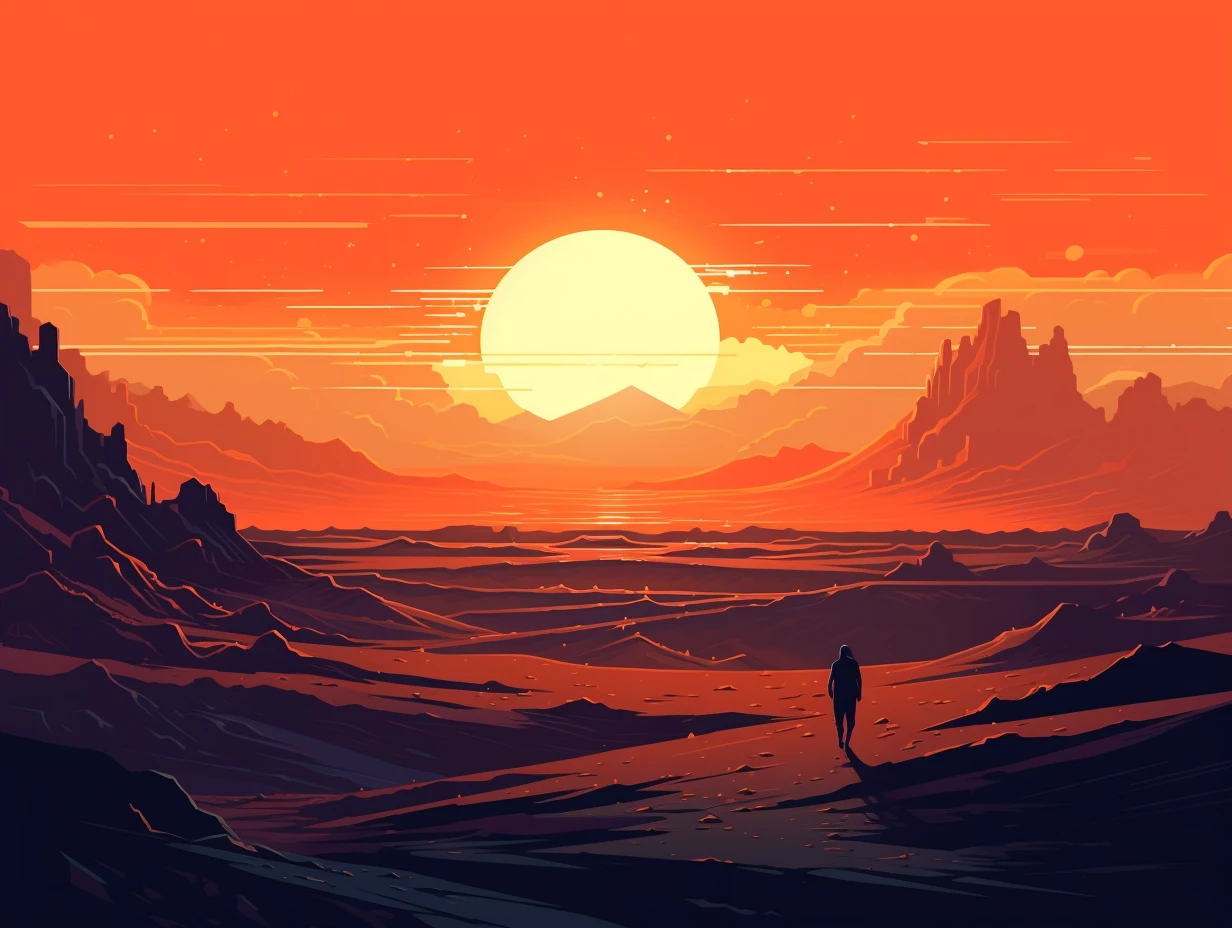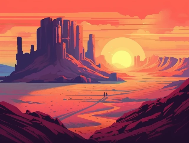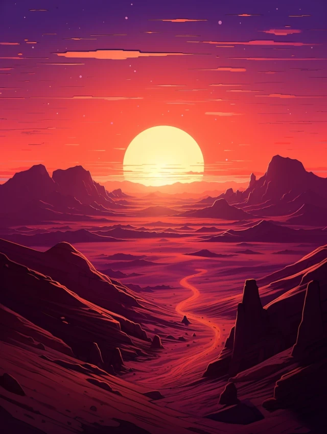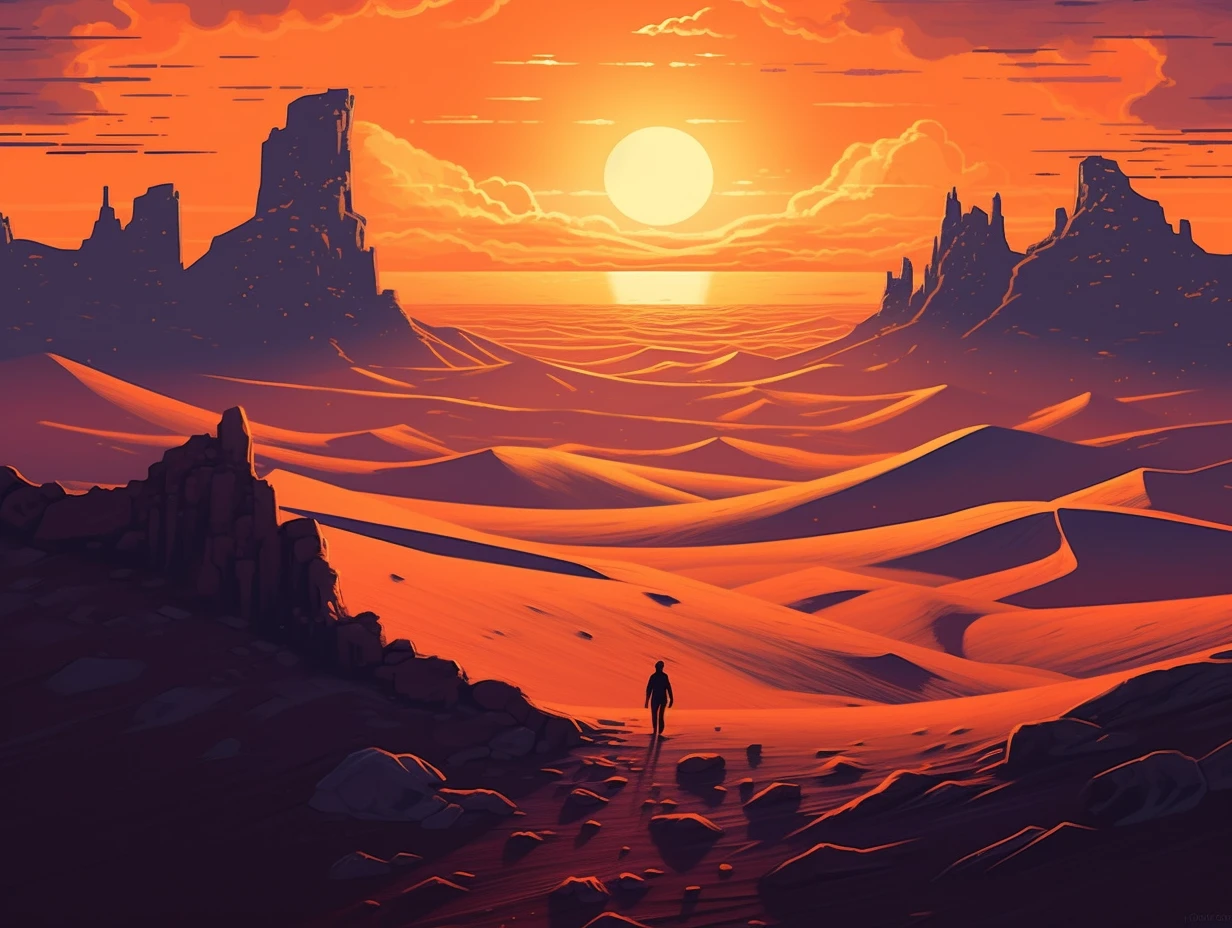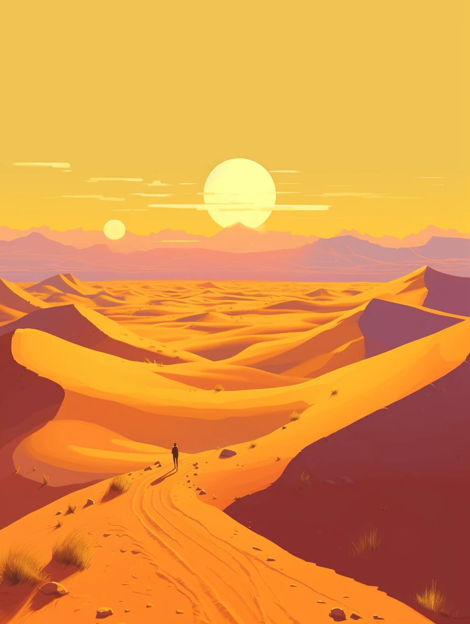 The relentless sun casts an intense glow over a stunning and unforgiving landscape. Towering sand dunes rise like colossal waves, their golden peaks shimmering under the blazing sun. This evocative scene captures the harsh beauty and unyielding spirit of the desert, where nature's extremes paint a mesmerizing canvas of contrasts, inviting adventurers to explore its secrets and challenges.